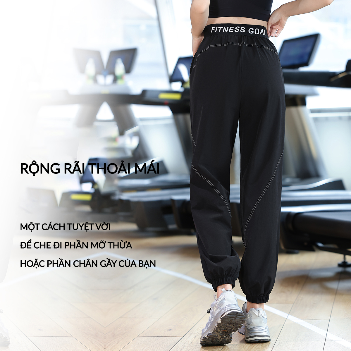 Quần tập được thiết kế phom jogger rộng phù hợp cho các hoạt động thể thao như yoga, tập gym, chạy bộ, leo núi và các môn thể thao khác